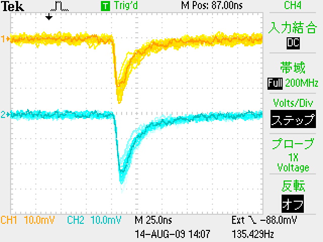 7/21 16:34 α線電荷シグナル w/o LPF, 100mV@ch1, 120mV@ch2 (ORTEC 571,572, peaking time=6us)