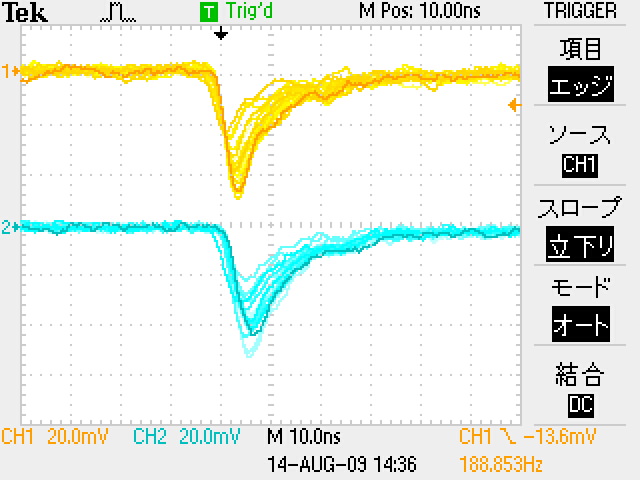 宇宙線用のトリガーはPMT1と2のシグナルのdiscriminatorの閾値をα線より大きく設定して行った。ch3とch4でのPMTシグナルからのクロストークを小さくするために、それぞれのHVを出来る限り小さくした(550Vと500V)。その時のdiscriminatorへの入力シグナルをここ(jpeg)に示した。同時に、200nsecのケーブルディレイを通したADC(2249W)への入力シグナルもここ(jpeg)に示した。後者は前者の約半分である。閾値は-61.7mVとした。また、α線トリガーには閾値を最小の-25mVとした。宇宙線とα線のトリガーレイトはそれぞれ1/分、140-190/秒であった。