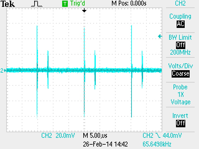 松定製の高電圧電源HLPM-1R3-SP(1kV,3W,リップル5mVp-p)をAPDのバイアス用電源(+400V)として使用したときの状況について報告した。添付ファイルのように周期15us,±60mVのスパイク状のノイズが電源ONと同時に出力される。このため、APDのシグナルを検出することができない。また、50HzのAC電源ノイズがあるが、これはHV電源がソースではなく、簡易アンテナによる検出・探索でNIMクレートなどからの空電のピックアップがノイズ源のようだ。これらノイズ研究の結果をelog (http://zenon.kek.jp/APD/42) に載せた。